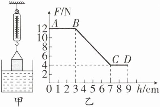 5. 如图甲所示,弹簧测力计下挂着一个物体,将物体从盛有适量水的烧杯上方离水面某一高度处缓缓下降,然后将其逐渐浸入水中,弹簧测力计示数F与物体下降高度h的关系如图乙所示。下列说法正确的是(g取10N/kg) ()