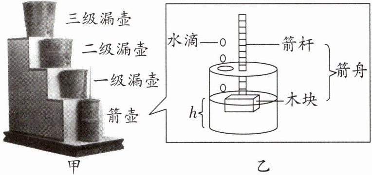 10. (2024八年级下深圳期末)如图甲所示为古代的计时工具——漏刻,其中箭壶的结构如图乙所示。随着一级漏壶中的水均匀滴入箭壶,箭壶中质量为0.3kg的箭舟随水面上升,通过箭杆上标注的刻度即可获取时间。求:($ρ_{水}= 1×10^{3}kg/m^{3}$,g取10N/kg)