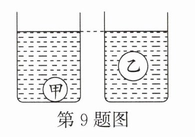 9. (不同液不同物)相同的两个烧杯中分别装有不同液体,把甲、乙两球分别轻轻放入两杯液体中,最后甲球沉底,乙球悬浮,如图所示。甲、乙两球排开液体质量相等,则 ()