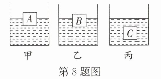 8. (同液不同物)如图所示,水平桌面上三个相同的容器内,盛有适量的水,将A、B、C三个体积相同的正方体分别放入容器内,静止后,容器内水面高度相同。下列说法正确的是 ()