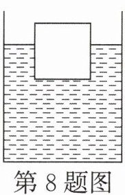 8. 如图所示,盛有2kg水的柱形容器置于水平地面上,重为6N不吸水的正方体,静止时有五分之三的体积浸入水中,物体下表面与水面平行,则物体的密度为$______kg/m^3,$物体下表面所受水的压力为______N。若物体在压力的作用下刚好浸没水中,不接触容器底,水不溢出,此时水对容器底部的压力为______N。(g取10N/kg,ρ水$= 1.0×10^3kg/m^3)$