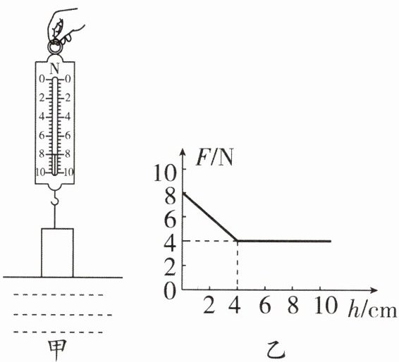 9. 用弹簧测力计悬挂一实心物块,物块下表面与水面刚好接触,如图甲所示。从此处匀速下放物块,直至浸没于水中并继续匀速下放(物块未与水底接触)。物块下放过程中,弹簧测力计示数F与物块下表面浸入水的深度h的关系如图乙。g取10N/kg,水的密度是$1.0×10^3kg/m^3。$求: