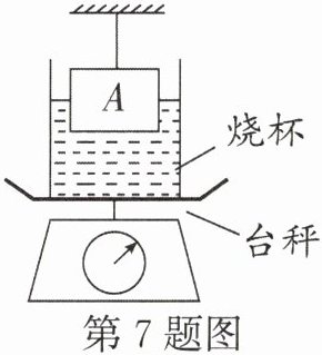 7. 如图所示,台秤上放置一个装有适量水的烧杯,已知烧杯和水的总质量为400g,杯的底面积为$100cm^2,$将一个质量为300g、体积为$200cm^3$的长方体实心物体A用细线吊着,然后将其一半浸入烧杯的水中(烧杯的厚度忽略不计,杯内水没有溢出,g取10N/kg)。则: