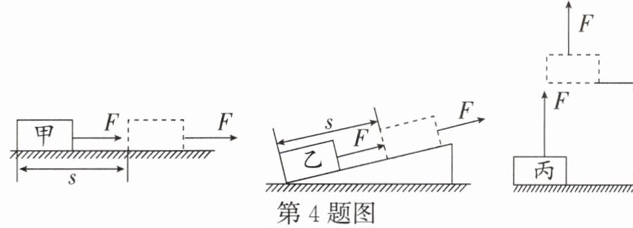 4. 现有甲、乙、丙三个质量不同的物体 $ (m_{甲} < m_{乙} < m_{丙}) $,在相等的恒力 $ F $ 作用下,分别在水平方向、沿斜面向上、竖直方向通过了相等的距离 $ s $,如图所示。 $ F $ 在三种情况下做的功分别为 $ W_{甲} $、$ W_{乙} $、$ W_{丙} $,三者大小判断正确的是 ()