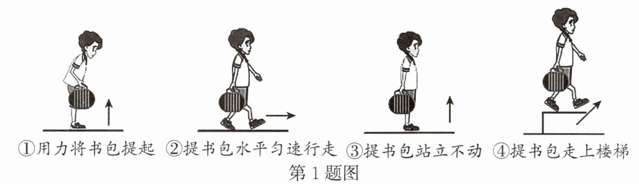 B 解析:①用力将书包提起,人对书包施加了向上的作用力,书包向上移动了一段距离,人对书包做了功;②提书包水平匀速行走,人对书包施加了向上的作用力,书包水平移动了一段距离,书包移动的方向和力的方向垂直,人没有对书包做功;③提书包站立不动,人对书包施加了向上的作用力,书包没有在力的方向上移动,人没有对书包做功;④提书包走上楼梯,人对书包施加了向上的作用力,书包向上移动了一段距离,人对书包做了功。综上所述,小亮提书包的力对书包做功的是①和④,故 B 符合题意,ACD 不符合题意。故选 B。