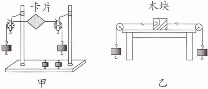 卡片 静止 减小摩擦力对实验结果的影响 解析:图甲的探究方案中卡片在水平方向上受到两个力的作用,研究对象是卡片。平衡状态包括静止或匀速直线运动,图乙中,木块处于静止状态时,说明木块已经平衡。图乙中木块与桌面之间存在较大的摩擦力;图甲实验用的卡片悬在空中不受摩擦力影响,所以图甲所示的实验方案优于图乙。