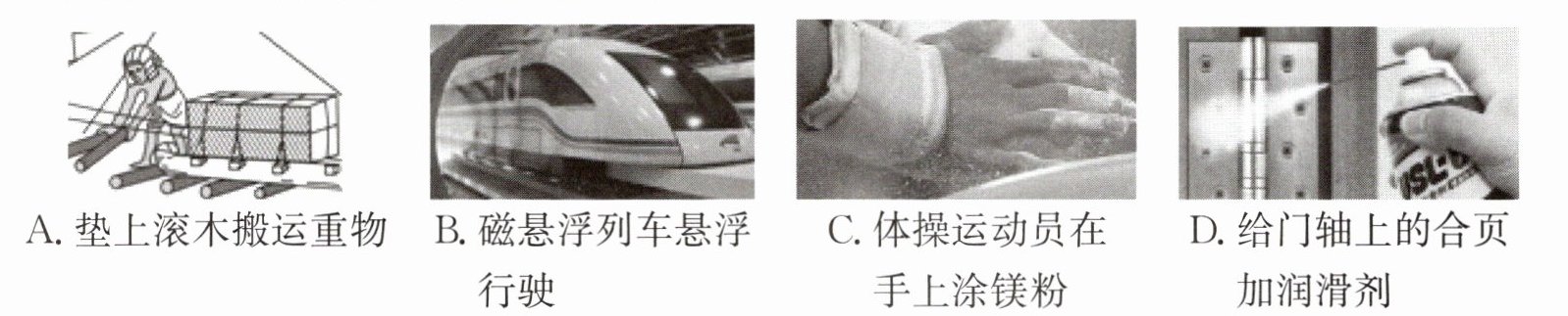 C 解析:A.垫上滚木搬运重物是用滚动代替滑动的方法来减小摩擦力,故A不合题意;B.磁悬浮列车悬浮行驶,是通过使接触面脱离的方法减小摩擦力,故B不合题意;C.体操运动员在手上涂镁粉,是在压力一定时,通过增大接触面的粗糙程度来增大摩擦力,故C符合题意;D.给门轴上的合页加润滑剂,是通过使接触面脱离的方法减小摩擦力,故D不合题意。