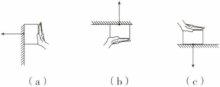 2. 如图所示,物体受到的重力为 50 N,手的压力为 70 N,请在横线上写出支持面受到的压力的大小。(a)$F= $______N;(b)$F= $______N;(c)$F= $______N。
