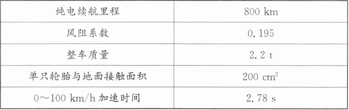9. (2024 八年级下深圳期中)某高性能电动汽车,由于其卓越的性能和极其优美的外观,被推上了舆论的风口浪尖,四驱版该电动汽车的部分参数如下,试求:(g 取 10 N/kg)
