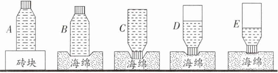 (2)通过比较图D、E 知,受力面积相同,压力大小不同,海绵的形变程度不同,说明受力面积相同时,压力的作用效果与压力大小有关。