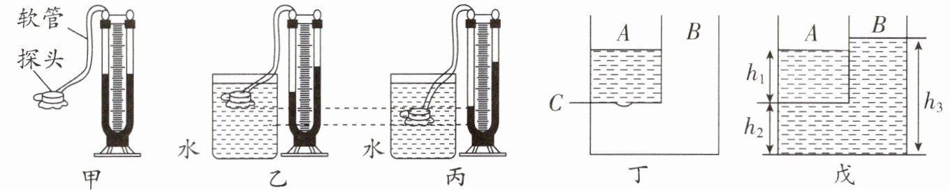 (4)小明自制了如图丁的实验装置,在A箱中加入水,A下部的橡皮膜C会凸起;如图戊所示,在B箱中加入某未知液体,直到橡皮膜变平,分别测出$h_1= 9cm,h_2= 12cm,h_3= 22cm,$则未知液体密度为$______kg/m^3。$(g取10N/kg,ρ水$= 1.0×10^3kg/m^3)$