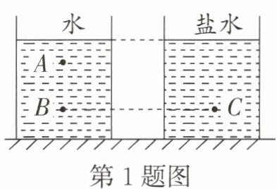 B 解析:A. 液体内部向各个方向都有压强,在同一深度,向各个方向的压强相等,所以 A 点向下的压强和向上的压强相等,故 A 错误;BD. 由图知,$h_{B}=h_{C}$,已知$\rho_{水}<\rho_{盐水}$,由$p=\rho gh$可知,B、C 两点的液体压强大小关系为$p_{B}<p_{C}$,故 B 正确,D 错误;C. 由图知,在水中,$h_{A}<h_{B}$,由$p=\rho gh$可知,A、B 两点水的压强大小关系为$p_{A}<p_{B}$,故 C 错误。