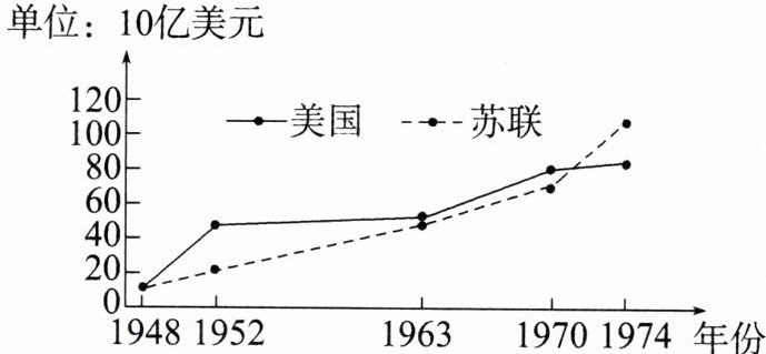7.新考法·跨学科(数学)(邯郸期末)下面的美苏军备开支数据图可用于说明第二次世界大战后(