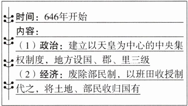 (1)政治:建立以天皇为中心的中央集权制度,地方设国、郡、里三级