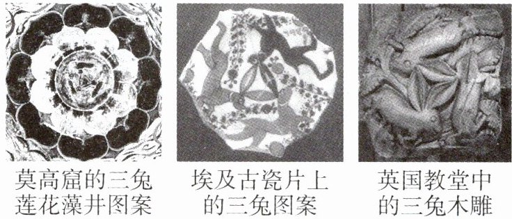 6.新考法·跨学科(美术)(西安月考)下面为古代“三兔共耳”图案——三只首尾相接的兔子共用三只耳朵,循环追逐、跳跃。这个图案最早出现于敦煌莫高窟,后来出现于13世纪埃及、叙利亚的彩陶上,以及中世纪欧洲教堂的屋顶浮雕与金属圣器上。这可以说明(
