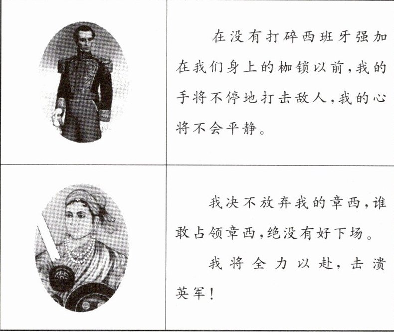 ①玻利瓦尔领导起义部队打败西班牙军队,成立了“大哥伦比亚共和国”,当选总统后,他继续领导南美洲的独立运动。②章西女王领导军民抗击进犯的英军,章西失陷后,她转战外地,直到壮烈牺牲。