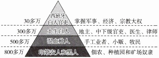 1.【教材相关史事改编】16世纪至19世纪初,拉丁美洲殖民地形成了一个按血统划分阶层的金字塔式的等级社会(如图所示)。由此可见,拉丁美洲掀起起义的主要目的是 (