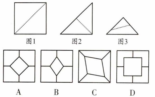例3 如图1,小强拿了一张正方形的纸,沿虚线对折一次得图2,再对折一次得图3,然后用剪刀沿图3中的虚线(虚线与底边不平行)剪去一个角,再打开后的形状应是 (