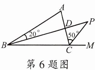 6.如图,BP是∠ABC的平分线,CP是∠ACM的平分线,∠ABP= 20°,∠ACP= 50°,则∠ADP= ______.
