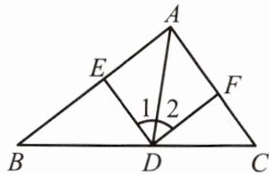 也可得出$AD$平分$\angle EDF$,即$\angle 1=\angle 2$。