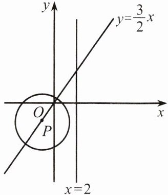 分析:(1)由圆与直线相切时圆心到直线的距离等于半径可知,应先找圆心到直线$x= 2$的距离刚好为3时的横坐标,再代入$y= \frac{3}{2}x$得纵坐标;(2)借助(1)题中的结论容易得解.