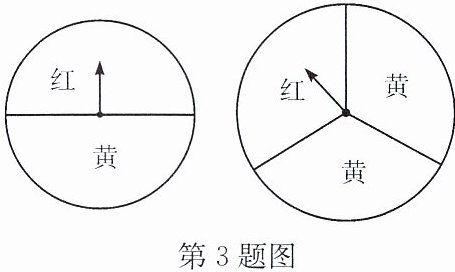共有6种等可能结果,其中一个指向红色区域,另一个指向黄色区域的结果有(红,黄)、(红,黄)、(黄,红),共3种。