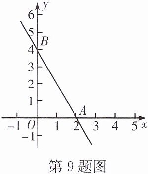 9. 如果两个一次函数$y= k_1x+b_1和y= k_2x+b_2满足k_1= k_2$,$b_1\neq b_2$,那么称这两个一次函数为"平行一次函数".如图,已知函数$y= -2x+4$的图象与x轴,y轴分别交于A,B两点,一次函数$y= kx+b与y= -2x+4$是"平行一次函数".
