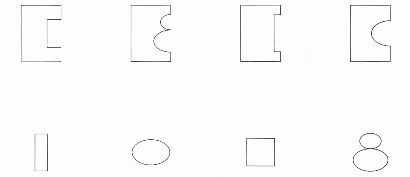 第一个图形连下面一行第三个图案(正方形);第二个图形连下面一行第四个图案(两个椭圆);第三个图形连下面一行第一个图案(长方形);第四个图形连下面一行第二个图案(椭圆)。