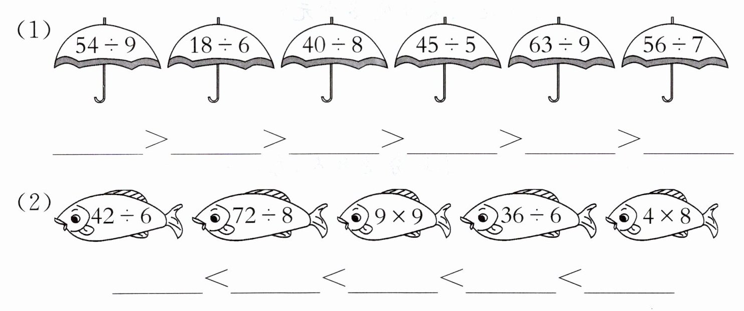 (1) $ 45 \div 5 $ $ 56 \div 7 $ $ 63 \div 9 $ $ 54 \div 9 $ $ 40 \div 8 $ $ 18 \div 6 $