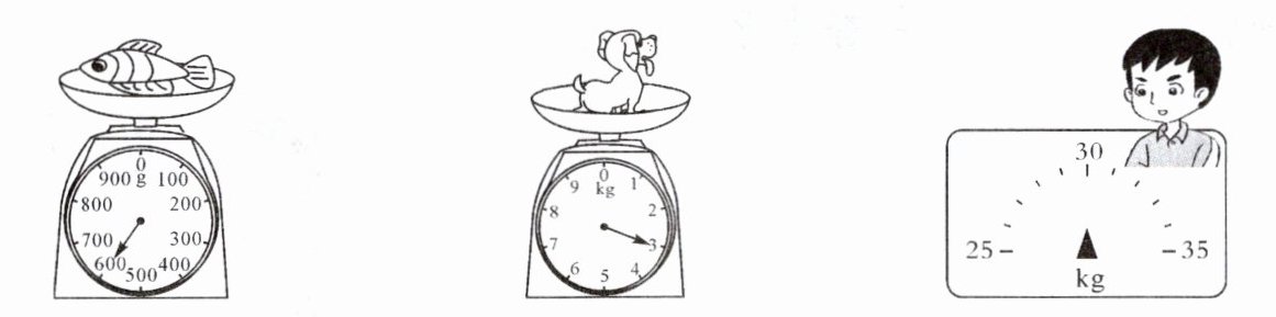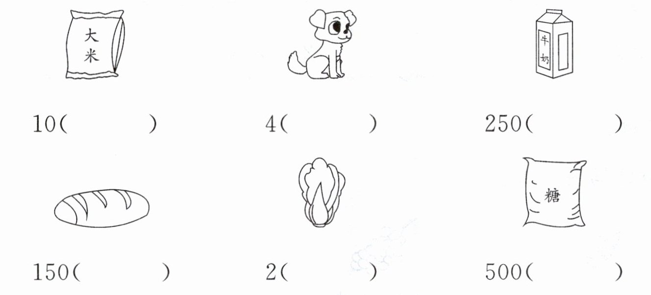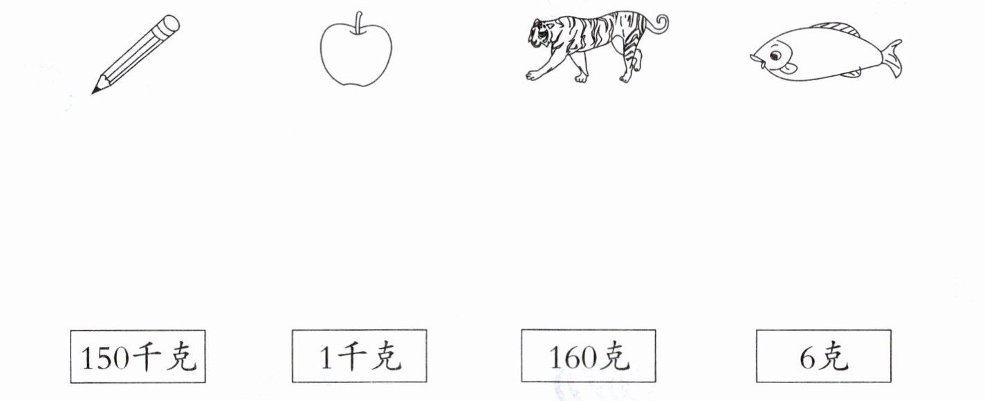 铅笔——6克;苹果——160克;鱼——1千克;老虎——150千克。