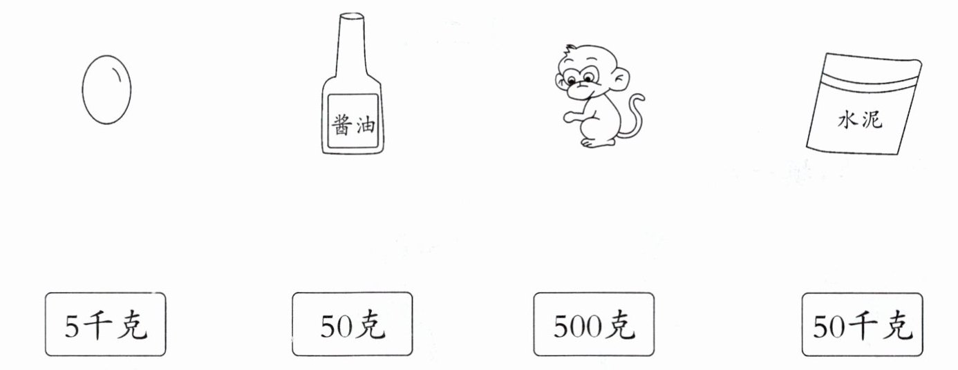 鸡蛋——$50$克;酱油——$500$克;猴子——$5$千克;水泥——$50$千克。