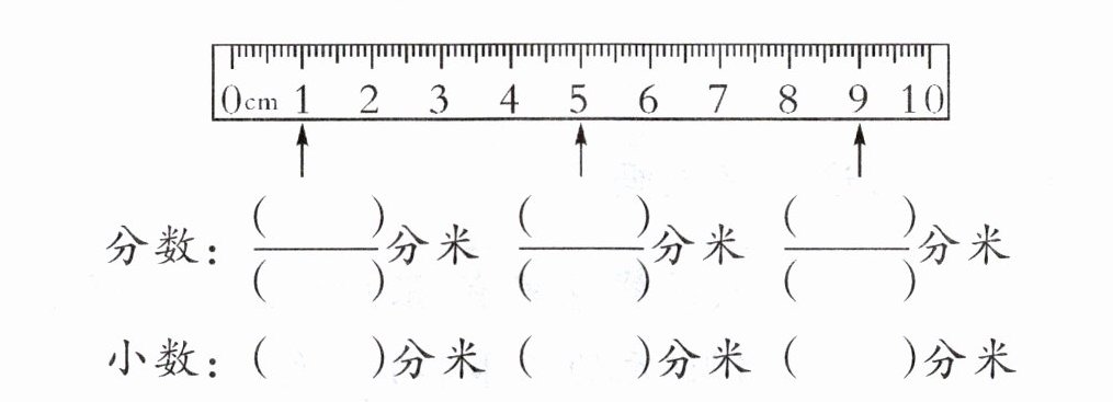 2. 把1分米平均分成10份,每份是1厘米。3厘米是$\frac {()}{()}$分米,还可以写成()分米。