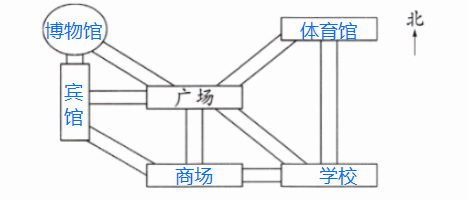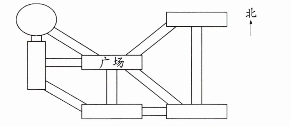 广场的西面是宾馆,南面是商场,博物馆和体育馆分别在广场的西北方向和东北方向,体育馆的南面是学校。