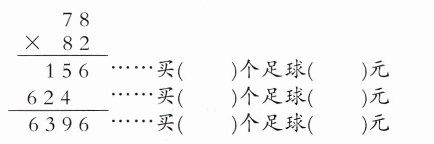 二、(河南省郑州市荥阳市期末)每个足球78元,学校买了82个足球。请根据下面的算式填空。