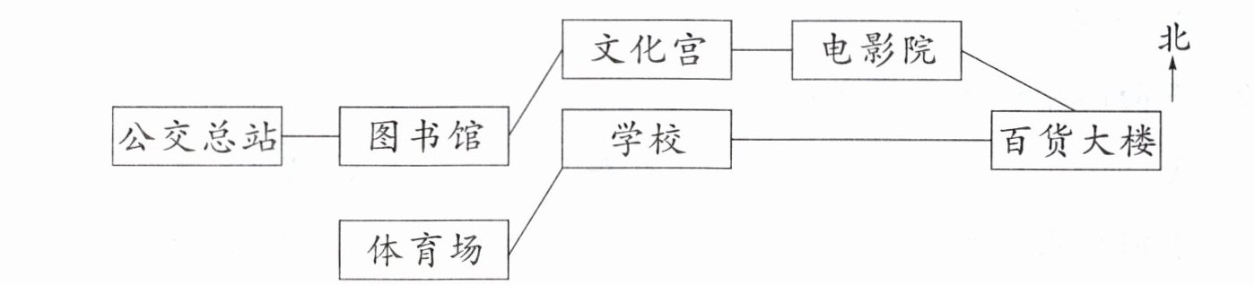 2. 小文乘公交车从电影院出发,向( )行驶到百货大楼,再向( )行驶到学校,最后向( )行驶到体育场。