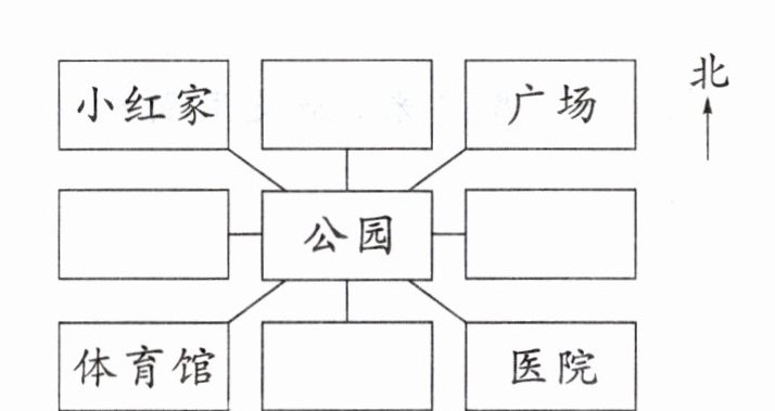 (2)医院在广场的( )面,体育馆在公园的( )方向。