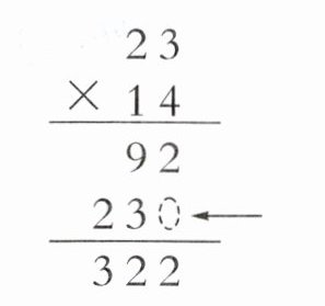 3. 如图,在$23×14$的竖式中,箭头所指的这一步表示的是( )。