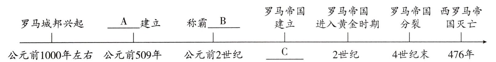 (1)材料一的时间轴反映了古罗马发展历程,请将其补充完整。(3分)