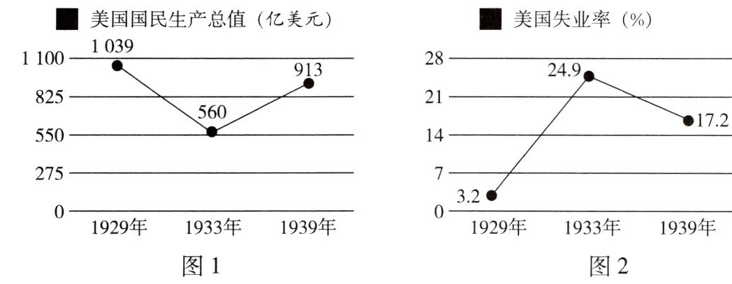 C 【解题思路】根据统计图可知,1933 年罗斯福新政开始实施后,美国国民生产总值回升,失业率有所下降,经济出现明显好转。故选 C。