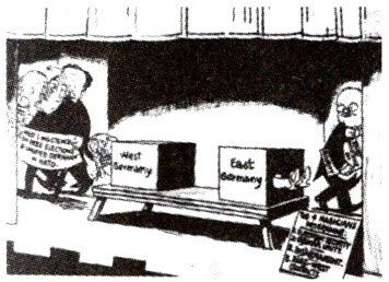 6. 下面是创作于20世纪50年代中期的漫画《就这样吧,直到我们下一次碰头》。漫画表现了一场分身魔术,左边的魔术师是美、英、法,右边的魔术师是苏联。据此判断,漫画创作的时代背景是 (
