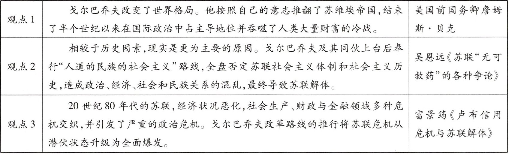 (2 分)观点 3:辩证看待,戈尔巴乔夫改革是苏联解体的原因之一。