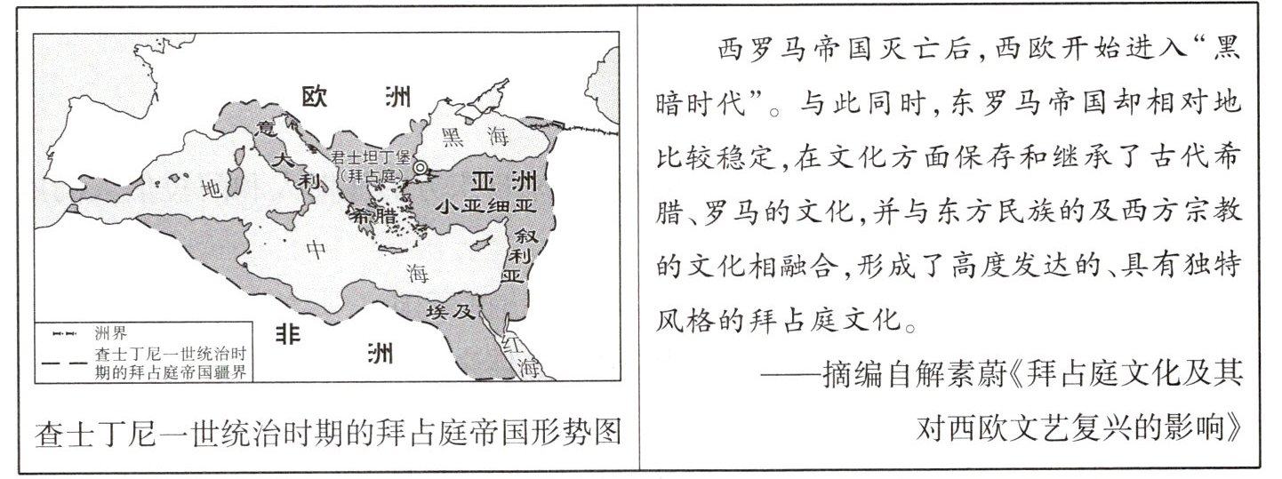 (1)表现:领土上,拜占庭帝国地跨欧、亚、非三洲;法律上,查士丁尼组织编纂的《罗马民法大全》奠定了欧洲民法的基础;文化上,拜占庭帝国对东西方文化兼收并蓄,创造出独具特色的拜占庭文化。(任答两点即可,4 分)