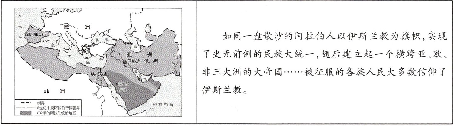 材料一 一个世纪内,他的信徒们从胜利走向胜利,建立了一个横跨亚、欧、非大陆的强大帝国,并传播了他的教义。如今,这一宗教在世界上拥有5亿信徒。如果以对事态发展的影响为标准,那么,穆罕默德无疑是历史上的一位巨人。