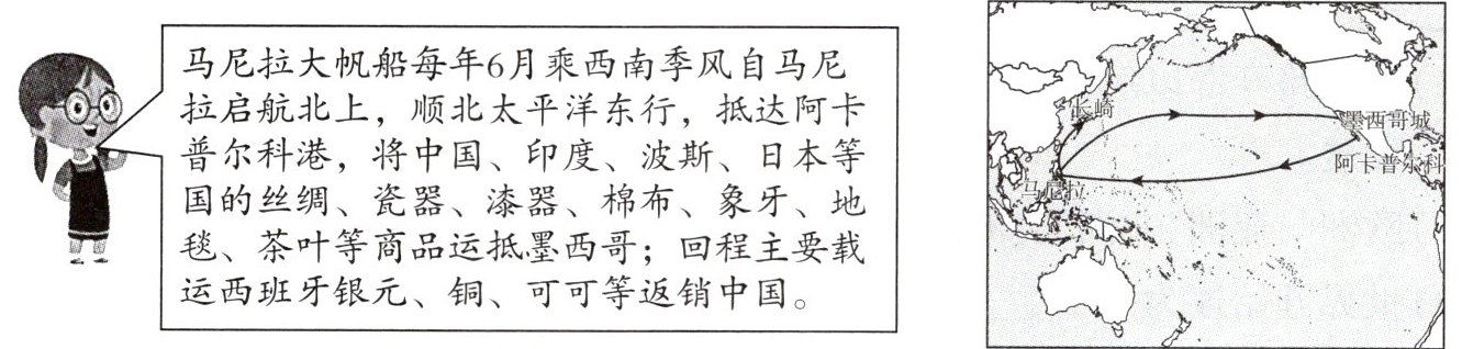 (3)根据材料三,指出马尼拉大帆船贸易主要路线连接的两大洲名称,并概括该贸易的特点。(6分)