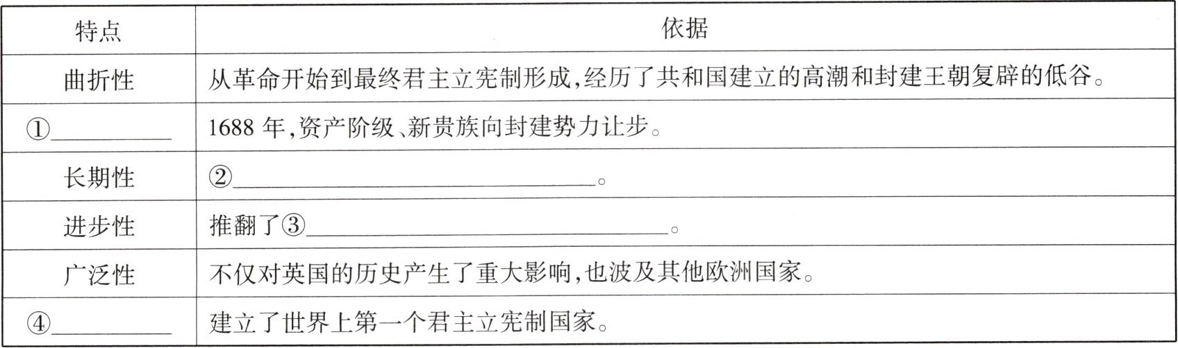 (1)①妥协性。(2 分)②从 1640 年到 1688 年,革命持续了近半个世纪。(2 分)③斯图亚特王朝的封建统治。(2 分)④开创性。(2 分)