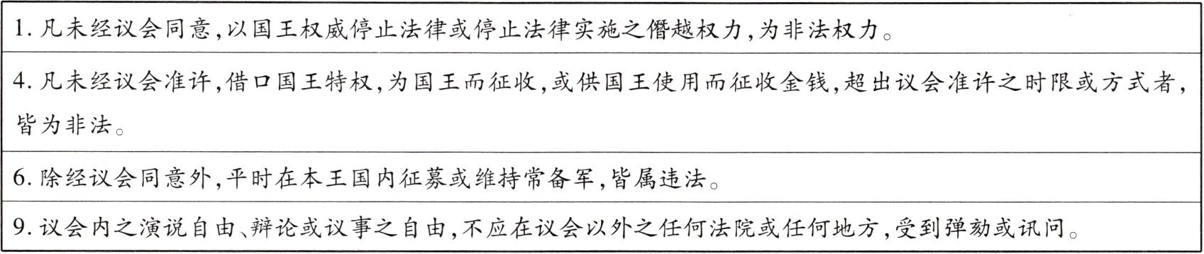 《权利法案》用明确的法律条文限制了国王的立法权、财政权、司法权和军权;将议会所拥有的“自由”和权力用法律的形式加以肯定;规定国王的权力由法律赋予,王权置于议会的法权之下。(任答两点即可)
