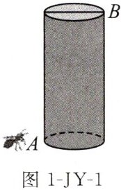 如图1-JY-1,一个圆柱的高为12 cm,底面圆的周长为18 cm.在圆柱下底面的点A处有一只蚂蚁,它想吃到上底面上与点A相对的点B处的食物,那么它沿圆柱侧面爬行的最短路程是多少?