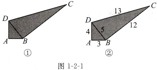 例 2(教材典题)一个零件的形状如图 1 - 2 - 1①所示,按规定这个零件中 $ \angle A $ 和 $ \angle DBC $ 都应为直角. 工人师傅量得这个零件各边尺寸如图②所示,这个零件符合要求吗?