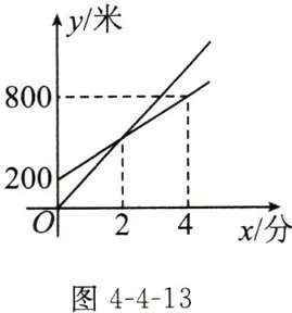 1. 小甬、小真两人同时进行跑步训练,他俩距离起点的路程y(米)和跑步时间x(分)之间的关系如图4-4-13所示,已知小甬的跑步速度比小真快,则下列说法正确的是 (