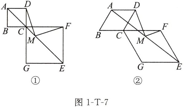 例7 如图1-T-7①所示,在正方形ABCD和正方形CGEF中,点B,C,F在同一条直线上,M是线段AE的中点,连接DM,FM.